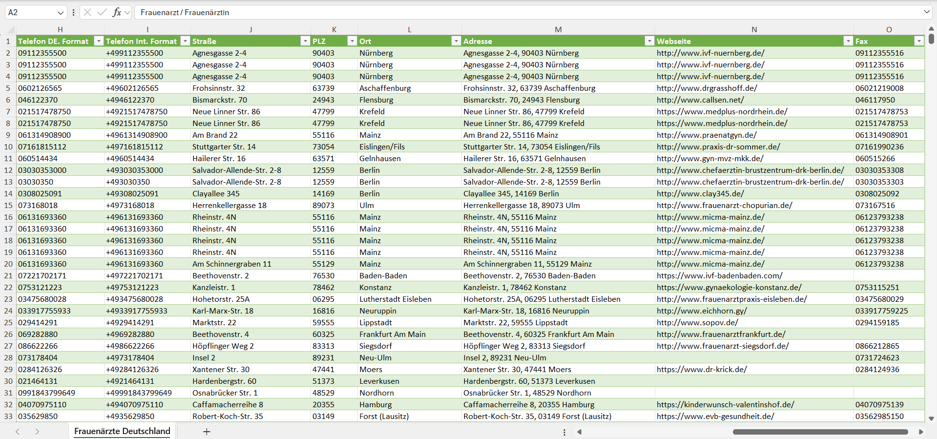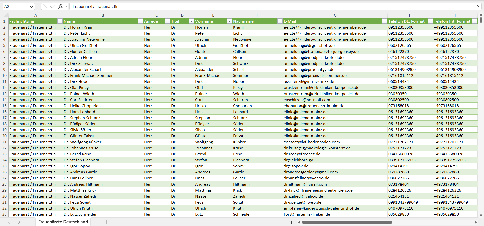 Die Liste aller Frauenärzte in Deutschland können Sie nach der Zahlung sofort als Excel-Tabellendokument im Standardformat herunterladen. Sie können die Kontaktdaten somit problemlos in Vertriebssoftware jeglicher Art wie Salesforce, CentralStation, HubSpot, Pipedrive, TecArt, SuperOffice, goTom, MailChimp, Klaviyo, rapidmail, Sendinblue, Jumpbird, Mailingwork, ActiveCampaign, GetResponse, CleverReach und vielen mehr integrieren. Auf Wunsch stellen wir Ihnen die Kontaktdaten der Frauenärzte auch gerne in weiteren Formaten wie CSV zur Verfügung.