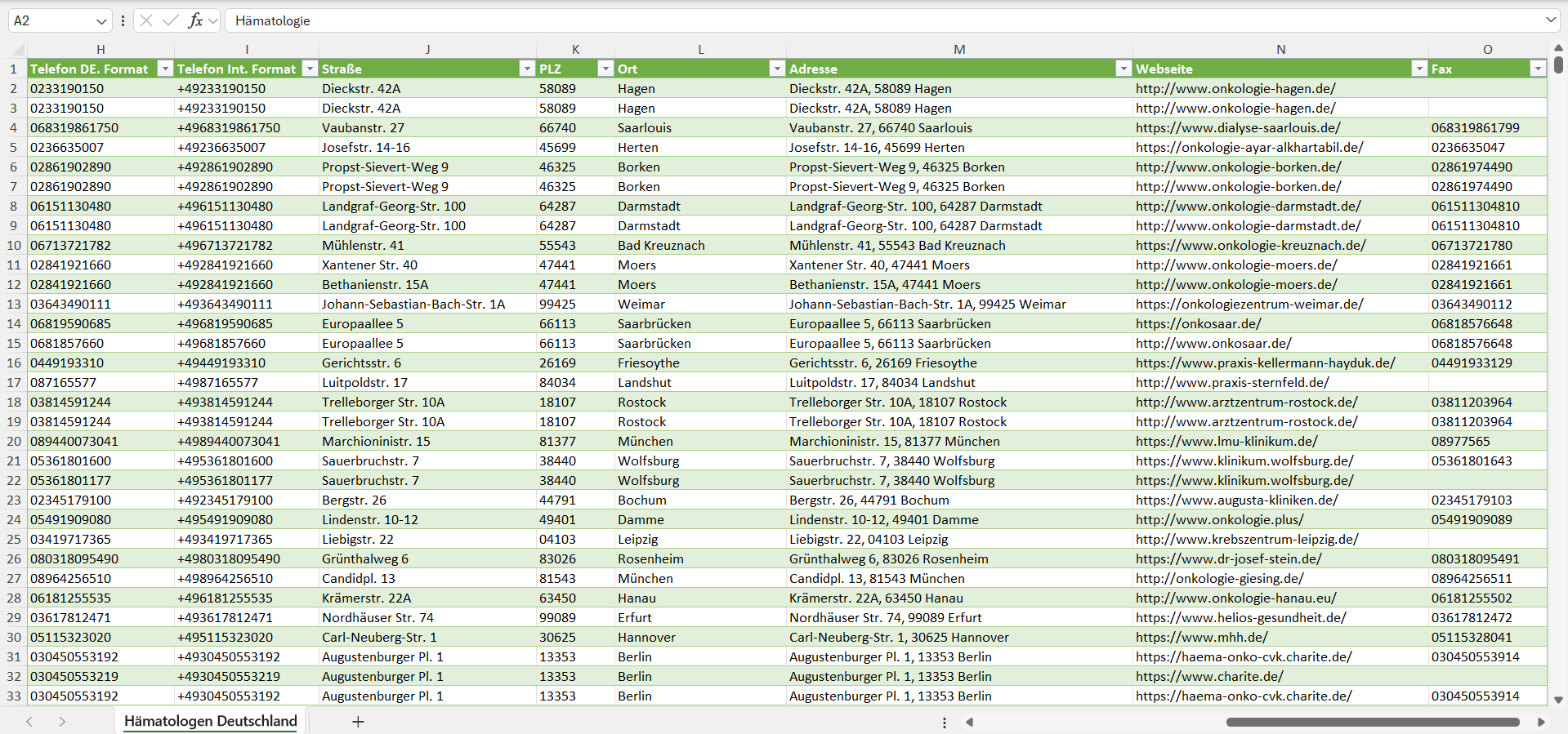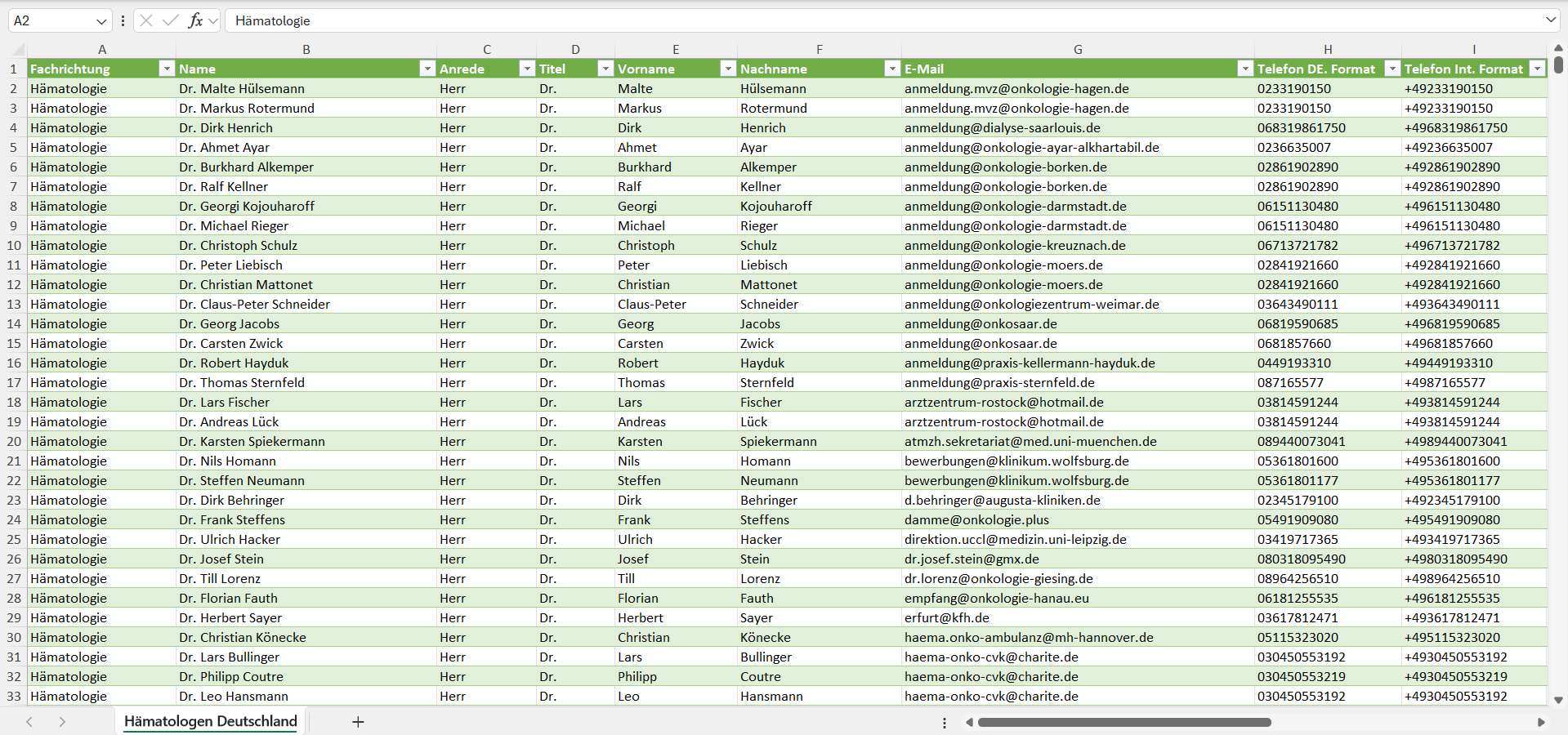 Die Liste aller Hämatologen in Deutschland können Sie nach der Zahlung sofort als Excel-Tabellendokument im Standardformat herunterladen. Sie können die Kontaktdaten somit problemlos in Vertriebssoftware jeglicher Art wie Salesforce, CentralStation, HubSpot, Pipedrive, TecArt, SuperOffice, goTom, MailChimp, Klaviyo, rapidmail, Sendinblue, Jumpbird, Mailingwork, ActiveCampaign, GetResponse, CleverReach und vielen mehr integrieren. Auf Wunsch stellen wir Ihnen die Kontaktdaten der Hämatologen auch gerne in weiteren Formaten wie CSV zur Verfügung.