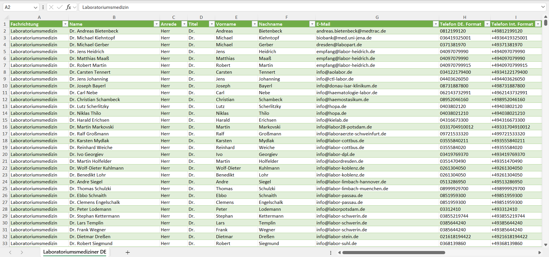 Die Liste aller Laboratoriumsmediziner in Deutschland können Sie nach der Zahlung sofort als Excel-Tabellendokument im Standardformat herunterladen. Sie können die Kontaktdaten somit problemlos in Vertriebssoftware jeglicher Art wie Salesforce, CentralStation, HubSpot, Pipedrive, TecArt, SuperOffice, goTom, MailChimp, Klaviyo, rapidmail, Sendinblue, Jumpbird, Mailingwork, ActiveCampaign, GetResponse, CleverReach und vielen mehr integrieren. Auf Wunsch stellen wir Ihnen die Kontaktdaten der Laboratoriumsmediziner auch gerne in weiteren Formaten wie CSV zur Verfügung.