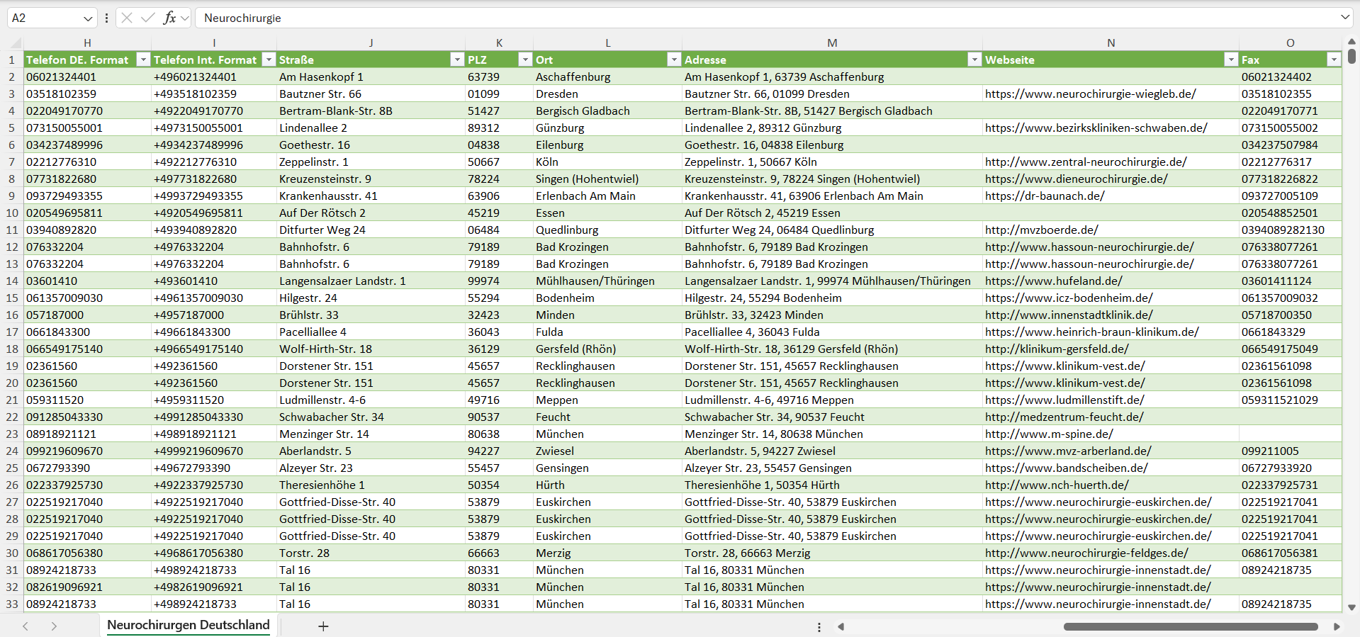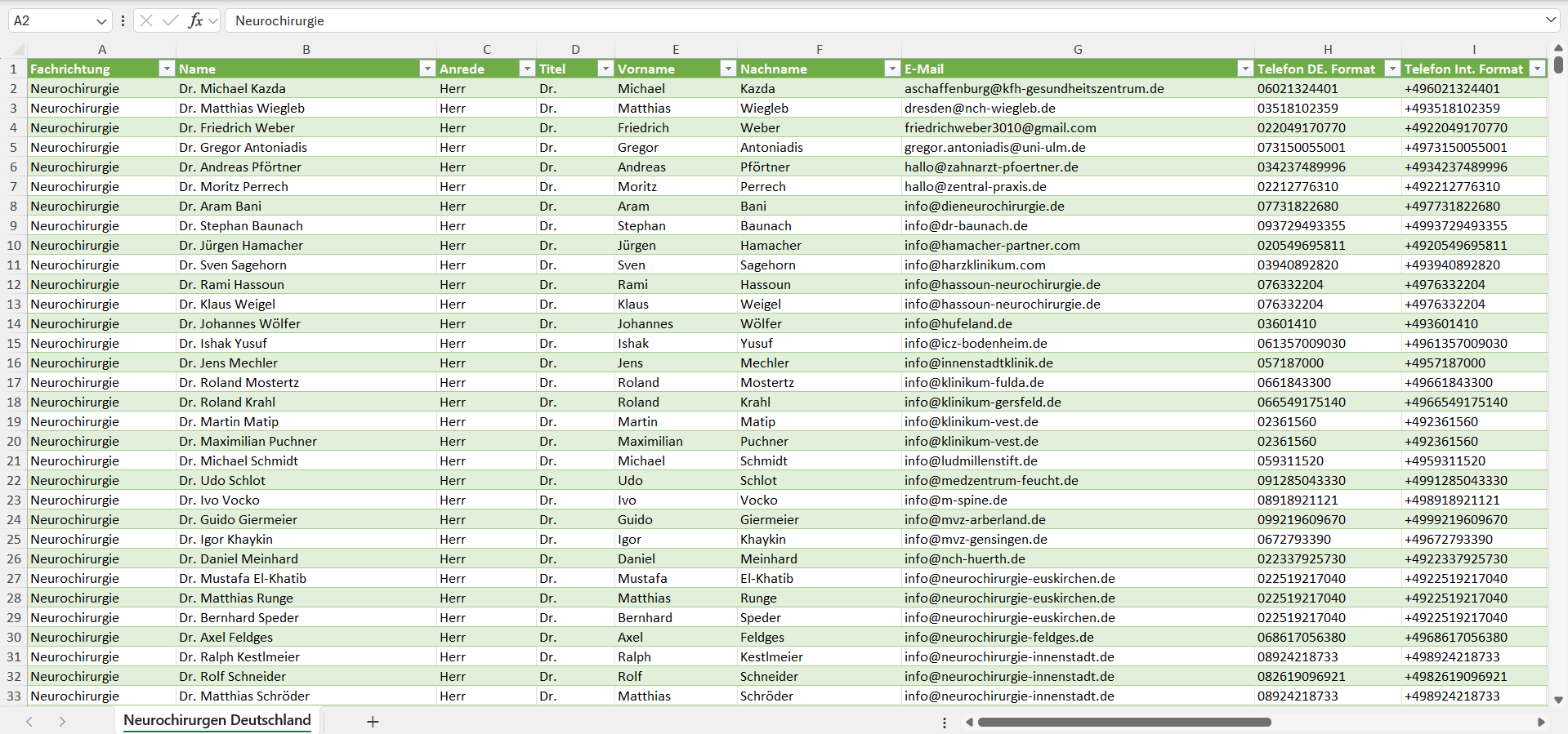 Die Liste aller Neurochirurgen in Deutschland können Sie nach der Zahlung sofort als Excel-Tabellendokument im Standardformat herunterladen. Sie können die Kontaktdaten somit problemlos in Vertriebssoftware jeglicher Art wie Salesforce, CentralStation, HubSpot, Pipedrive, TecArt, SuperOffice, goTom, MailChimp, Klaviyo, rapidmail, Sendinblue, Jumpbird, Mailingwork, ActiveCampaign, GetResponse, CleverReach und vielen mehr integrieren. Auf Wunsch stellen wir Ihnen die Kontaktdaten der Neurochirurgen auch gerne in weiteren Formaten wie CSV zur Verfügung.
