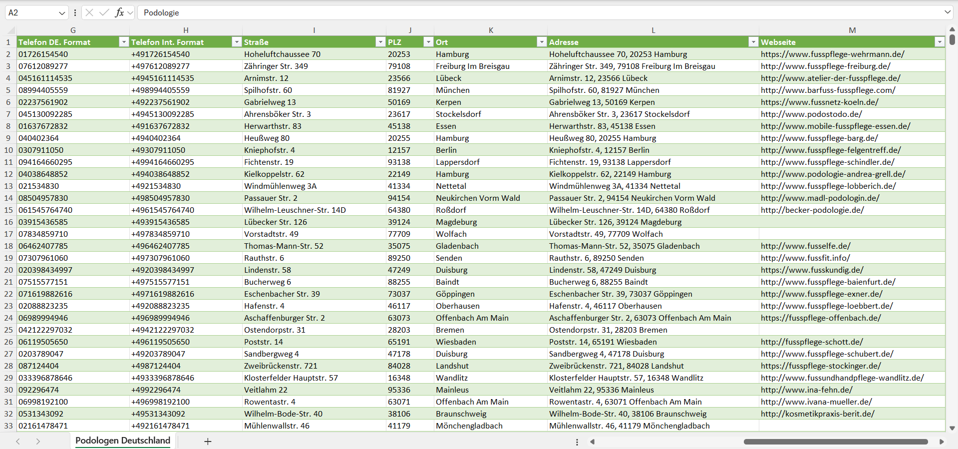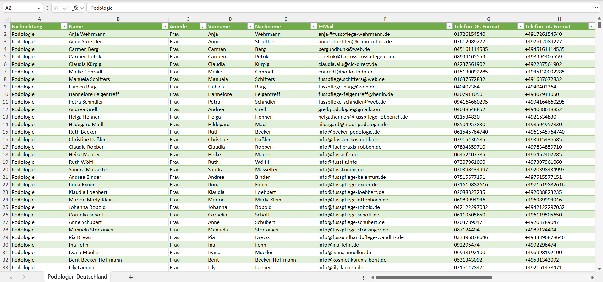 Die Liste aller Podologen in Deutschland können Sie nach der Zahlung sofort als Excel-Tabellendokument im Standardformat herunterladen. Sie können die Kontaktdaten somit problemlos in Vertriebssoftware jeglicher Art wie Salesforce, CentralStation, HubSpot, Pipedrive, TecArt, SuperOffice, goTom, MailChimp, Klaviyo, rapidmail, Sendinblue, Jumpbird, Mailingwork, ActiveCampaign, GetResponse, CleverReach und vielen mehr integrieren. Auf Wunsch stellen wir Ihnen die Kontaktdaten der Podologen auch gerne in weiteren Formaten wie CSV zur Verfügung.
